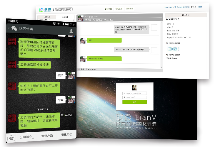 在线微信客服系统,及时与访客互动,提升企业形象,让商家与微信7亿用户实时沟通,创造无限商机。